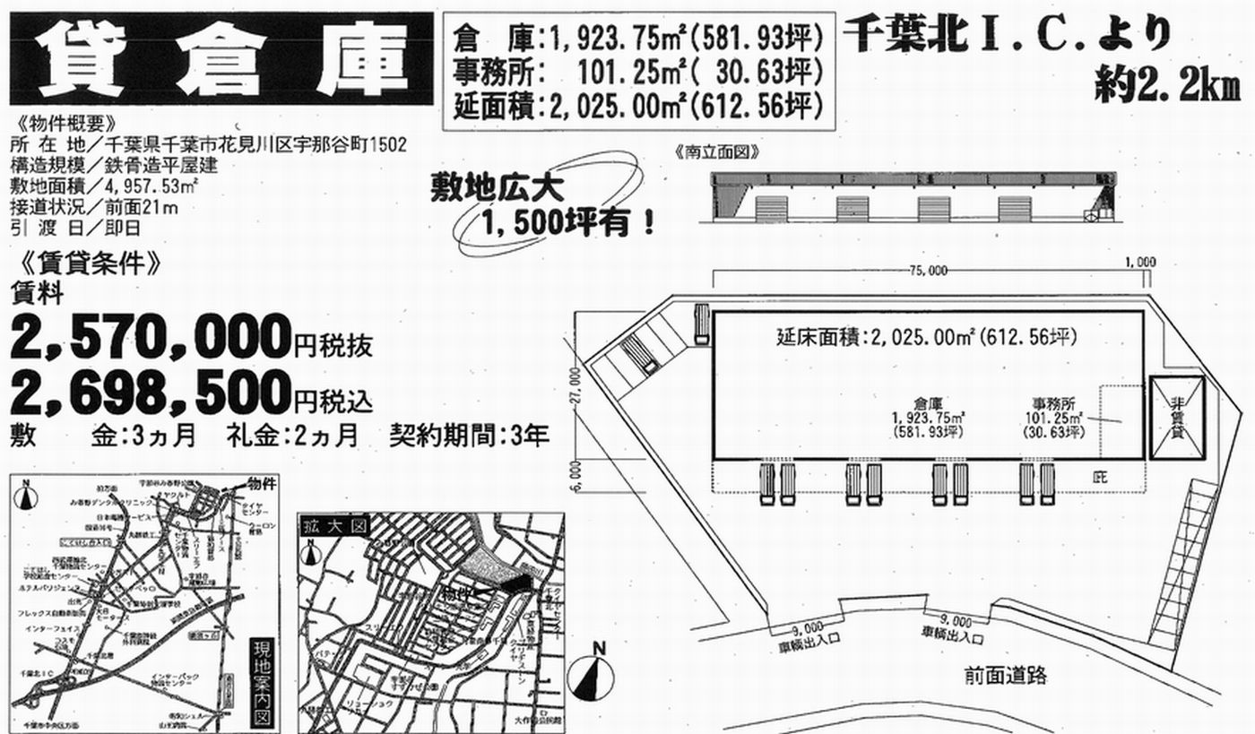 | 備考 | 敷地広大 配送センター最適!! 40ftトレーラー可 事務所付 千葉北ICより約2.2KM 使用用途・条件交渉ご相談下さい。 |