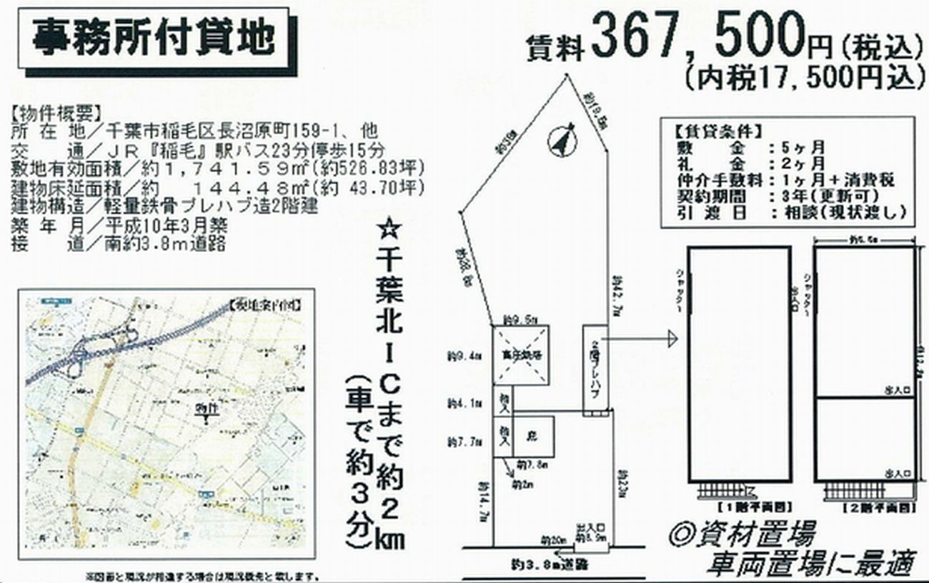 | 備考 | 千葉北ICまで約2KM 2階建てプレハブシャッター付 広い敷地資材置き場・車両置き場最適!! 使用用途・条件交渉ご相談下さい。 (解体業相談可) |