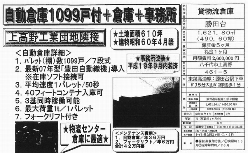 | 備考 | 上高野工業団地隣接 男女トイレ2か所有 フォークリフト付き 条件交渉ご相談下さい。 |