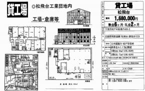 テナントSNAPでは千葉県松戸市松飛台439−2をはじめ、東京・神奈川・千葉・埼玉・横浜・川崎等、首都圏を中心に貸し倉庫・工場・貸し土地の情報を簡単検索。千葉県松戸市松飛台439−2のクレーン付、キュービクル、工業地域の貸倉庫・貸工場も情報満載!千葉県松戸市松飛台439−2で貸し倉庫・貸し工場・貸地・貸倉庫・貸工場・貸地は物件数No1のテナントSNAPにお任せ下さい。その他、千葉県松戸市松飛台439−2で貸し倉庫・工場・貸し土地を所有のオーナー様には無料で貸し倉庫・貸し工場の広告を掲載致します。貸し倉庫・工場・貸し土地を貸したい方も是非、テナントSNAPにお任せ下さい。 |
