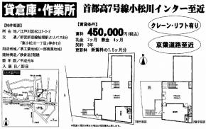 テナントSNAPでは東京都江戸川区松江1-3-2をはじめ、東京・神奈川・千葉・埼玉・横浜・川崎等、首都圏を中心に貸し倉庫・工場・貸し土地の情報を簡単検索。東京都江戸川区松江1-3-2のクレーン付、キュービクル、工業地域の貸倉庫・貸工場も情報満載!東京都江戸川区松江1-3-2で貸し倉庫・貸し工場・貸地・貸倉庫・貸工場・貸地は物件数No1のテナントSNAPにお任せ下さい。その他、東京都江戸川区松江1-3-2で貸し倉庫・工場・貸し土地を所有のオーナー様には無料で貸し倉庫・貸し工場の広告を掲載致します。貸し倉庫・工場・貸し土地を貸したい方も是非、テナントSNAPにお任せ下さい。 |