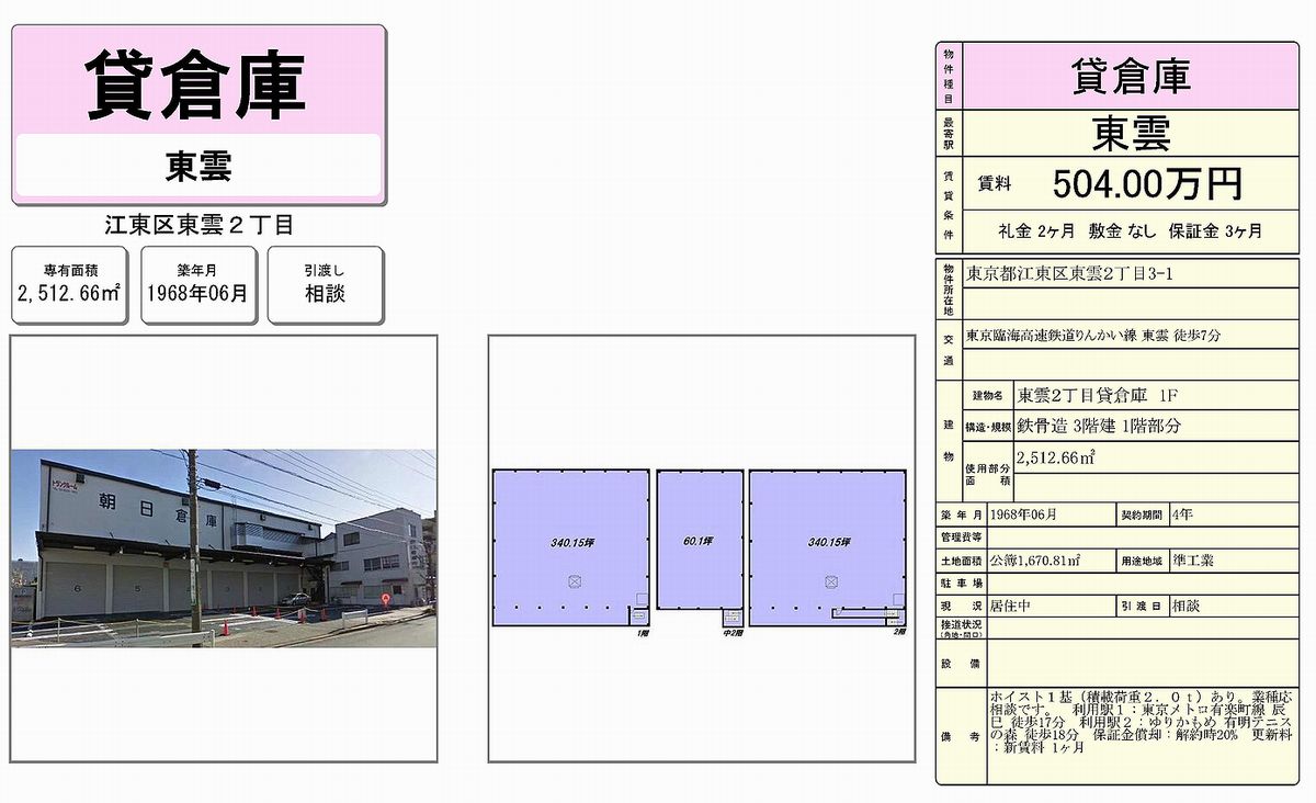 東京都江東区東雲2-3-1 朝日倉庫 詳細データ