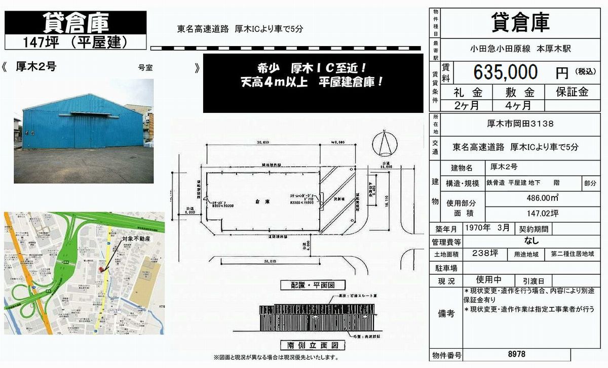 トップページ > 物件検索 > 神奈川県 の貸倉庫・貸工場 > 厚木市 の貸倉庫・貸工場 > 厚木市岡田3138 厚木2号