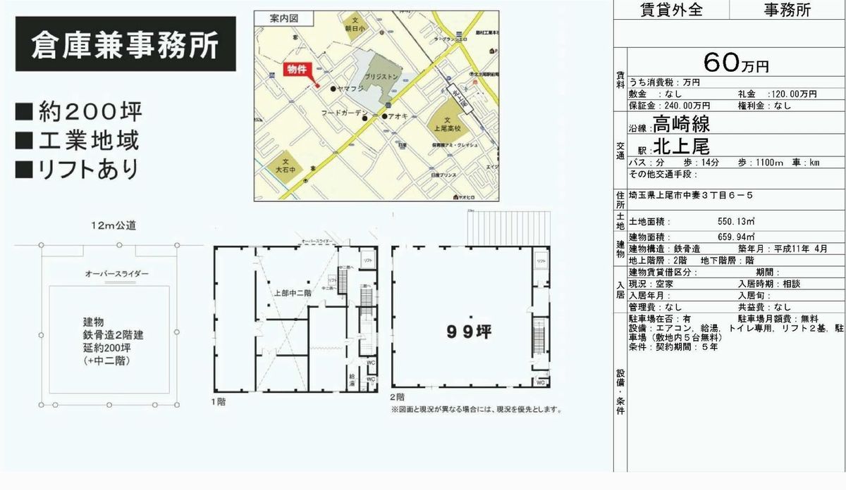 埼玉県上尾市中妻3-6-5 北上尾駅 貸倉庫 一棟貸 詳細データ