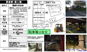 | 備考 | 天井高5M以上 前面シャッター シャッター高4500 駐車場10台分付 事務所棟にトイレ・キッチン有 中2階有 |