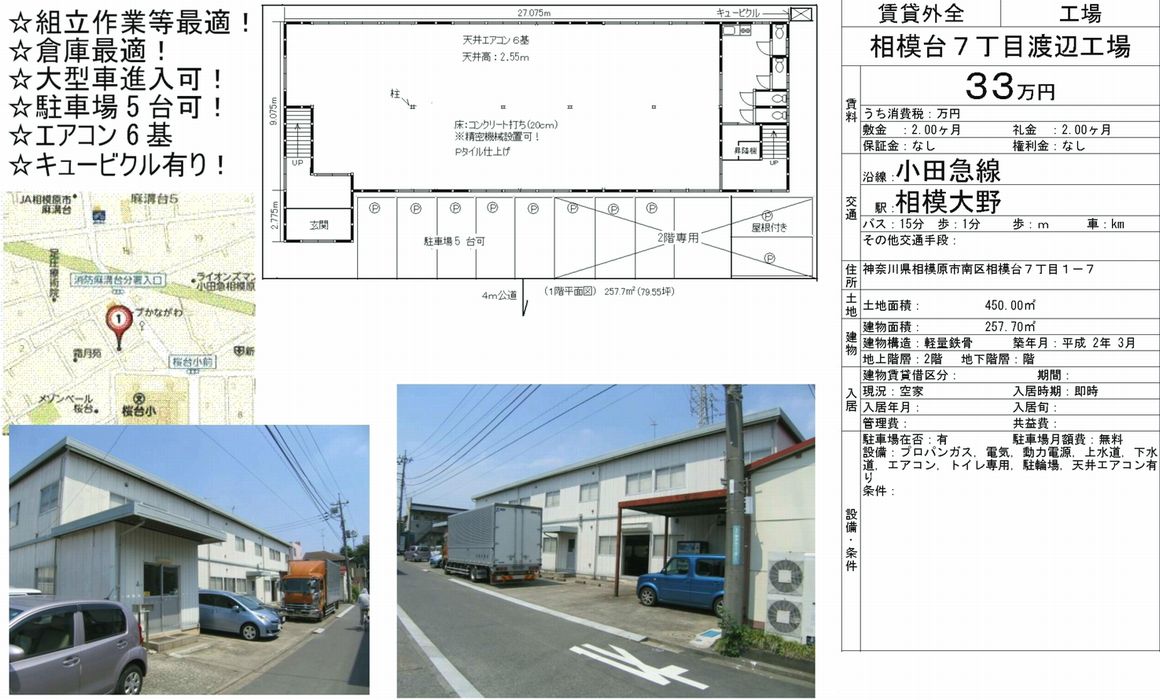 トップページ > 物件検索 > 神奈川県 の貸倉庫・貸工場 > 相模原市 の貸倉庫・貸工場 > 相模原市南区相模台7-1-7 渡辺工場