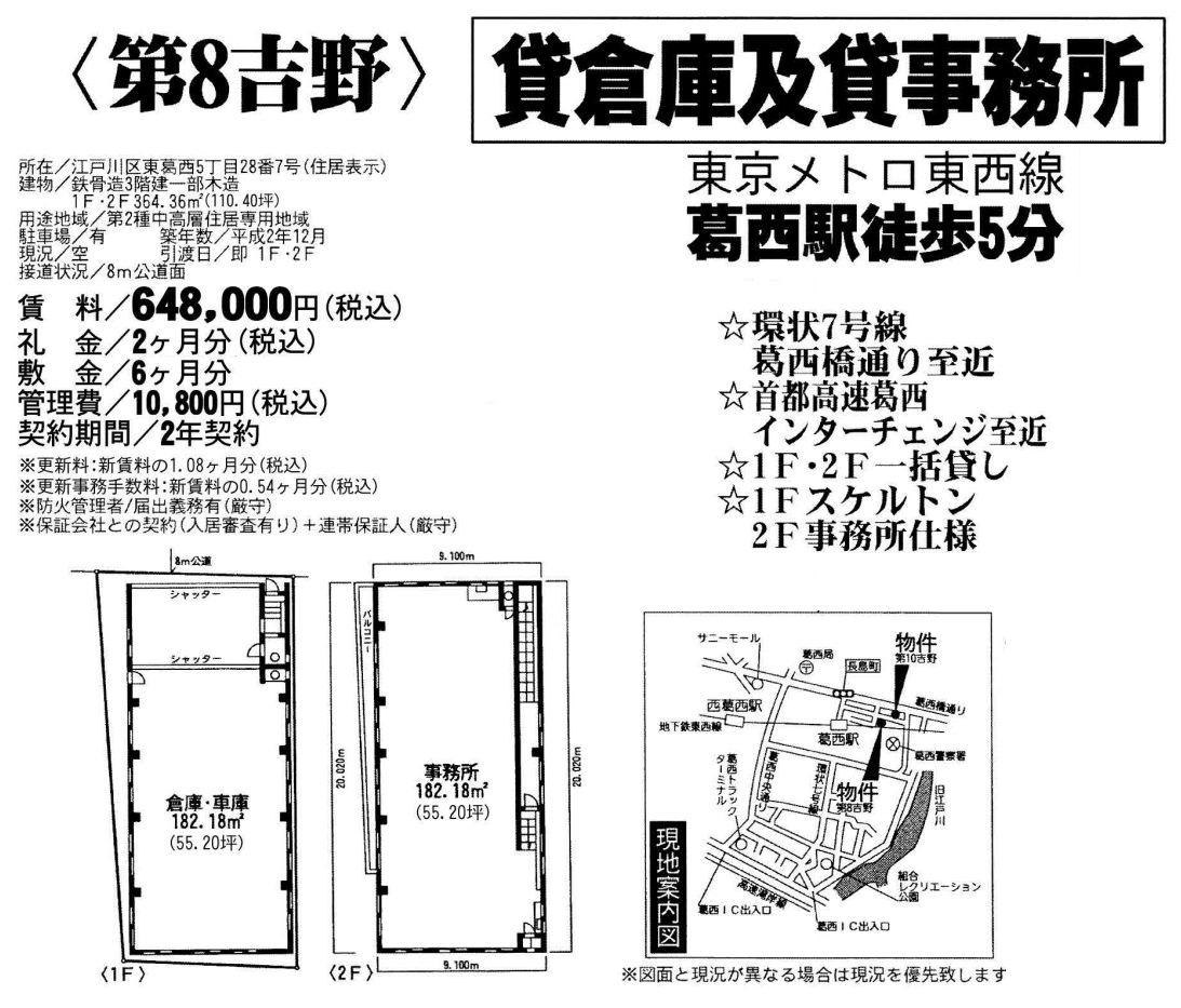 トップページ > 物件検索 > 東京都 の貸倉庫・貸工場 > 江戸川区 の貸倉庫・貸工場 > 江戸川区東葛西5-28-7 第8吉野 1-2F部分