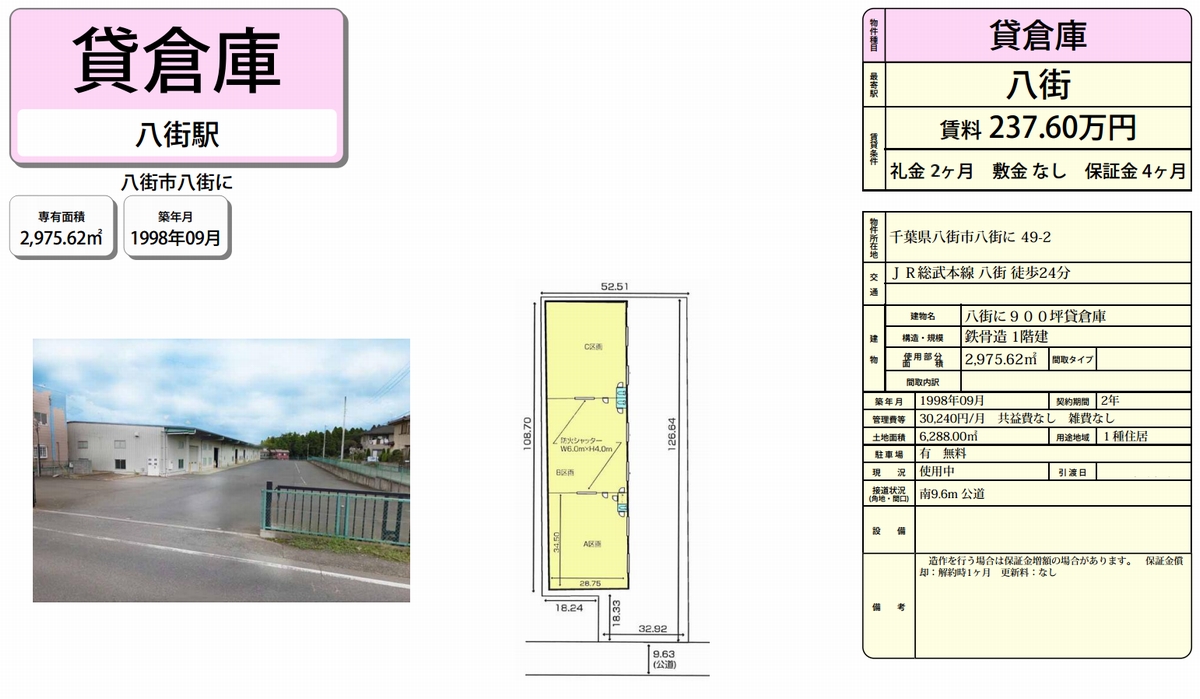 千葉県八街市八街に49-2 八街駅 貸倉庫 詳細データ