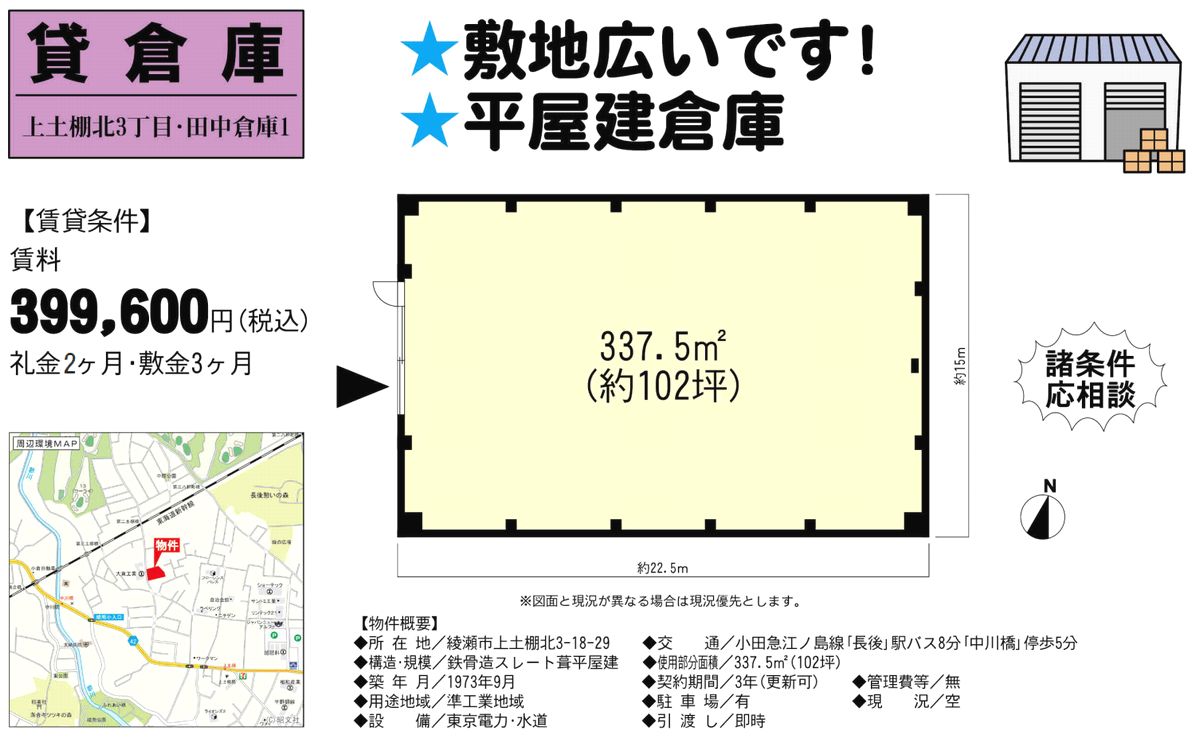 神奈川県綾瀬市上土棚北3-18-29 田中倉庫1 詳細データ