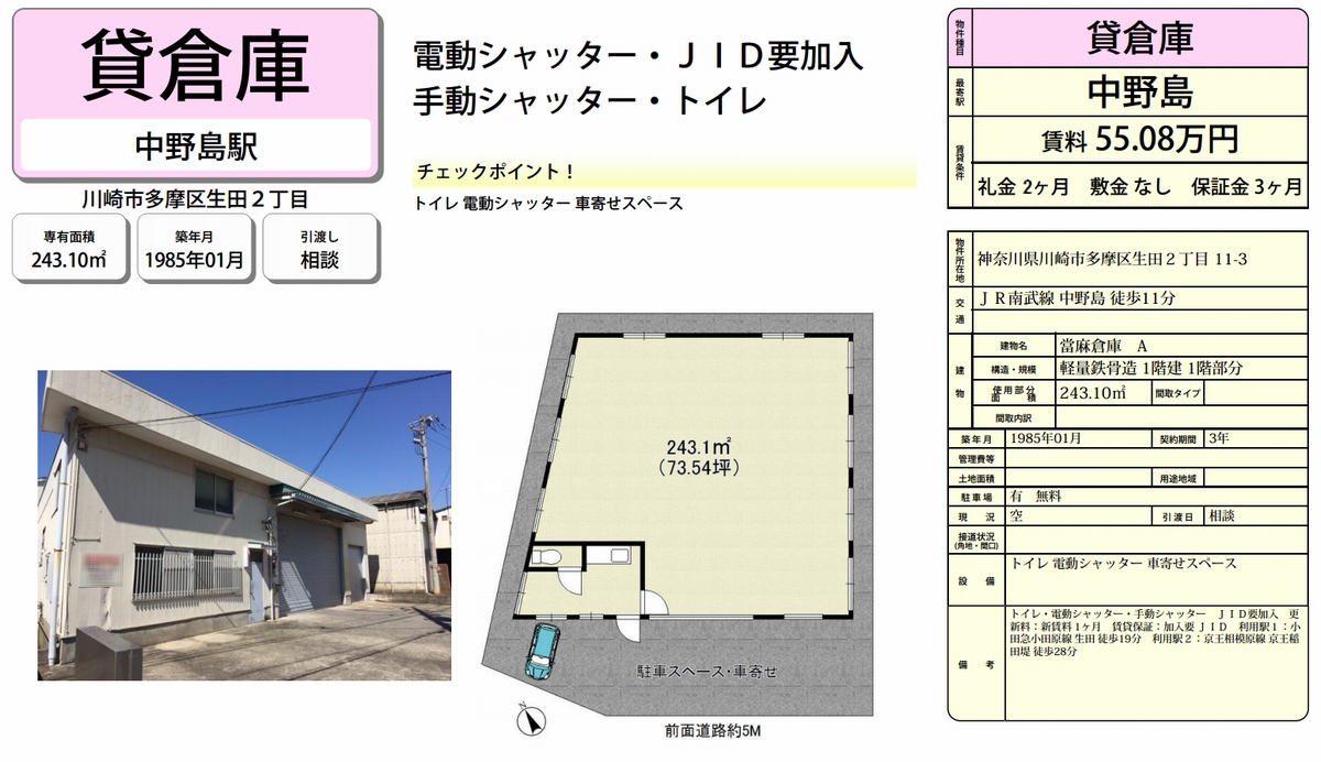 テナントSNAPでは神奈川県川崎市多摩区生田2-11-8をはじめ、東京・神奈川・千葉・埼玉・横浜・川崎等、首都圏を中心に貸し倉庫・工場・貸し土地の情報を簡単検索。神奈川県川崎市多摩区生田2-11-8のクレーン付、キュービクル、工業地域の貸倉庫・貸工場も情報満載!神奈川県川崎市多摩区生田2-11-8で貸し倉庫・貸し工場・貸地・貸倉庫・貸工場・貸地は物件数No1のテナントSNAPにお任せ下さい。その他、神奈川県川崎市多摩区生田2-11-8で貸し倉庫・工場・貸し土地を所有のオーナー様には無料で貸し倉庫・貸し工場の広告を掲載致します。貸し倉庫・工場・貸し土地を貸したい方も是非、テナントSNAPにお任せ下さい。 |