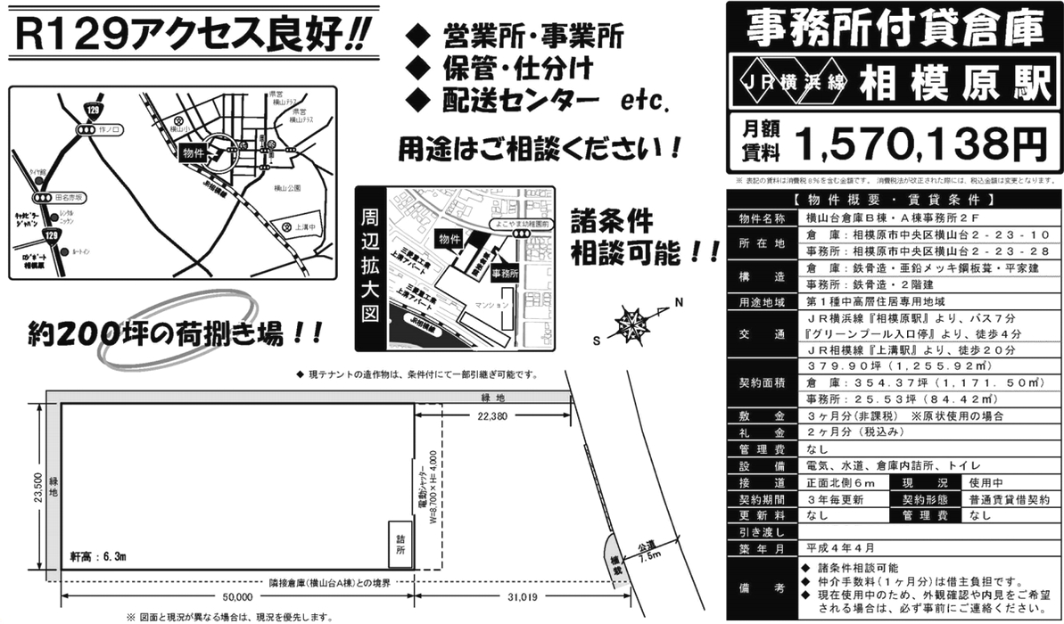 | 備考 | 天井高5M以上 電動シャッター トイレ 約200坪の荷捌き場 事務所棟25.83坪含む |