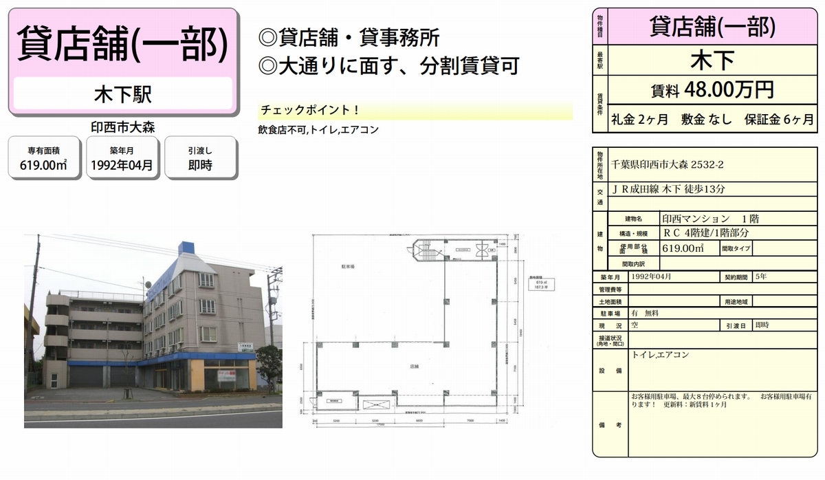 テナントSNAPでは千葉県印西市大森2532-2をはじめ、東京・神奈川・千葉・埼玉・横浜・川崎等、首都圏を中心に貸し倉庫・工場・貸し土地の情報を簡単検索。千葉県印西市大森2532-2のクレーン付、キュービクル、工業地域の貸倉庫・貸工場も情報満載!千葉県印西市大森2532-2で貸し倉庫・貸し工場・貸地・貸倉庫・貸工場・貸地は物件数No1のテナントSNAPにお任せ下さい。その他、千葉県印西市大森2532-2で貸し倉庫・工場・貸し土地を所有のオーナー様には無料で貸し倉庫・貸し工場の広告を掲載致します。貸し倉庫・工場・貸し土地を貸したい方も是非、テナントSNAPにお任せ下さい。 |