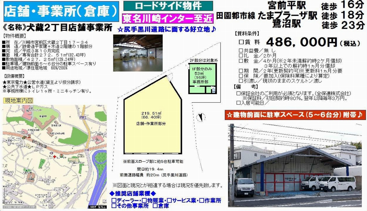 神奈川県川崎市宮前区犬蔵2-17-34 宮前平 倉庫事務所 詳細データ