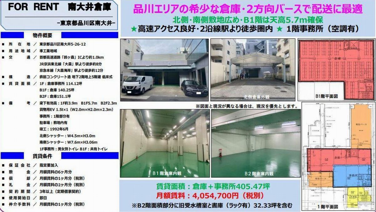 | 物件名 | 南大井 貸倉庫 B2-1F部分 |