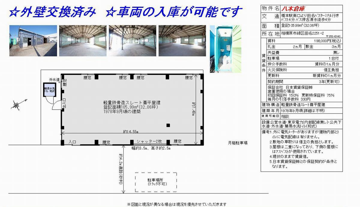 | 備考 | 簡易トイレ シャッター 車両入庫可 |