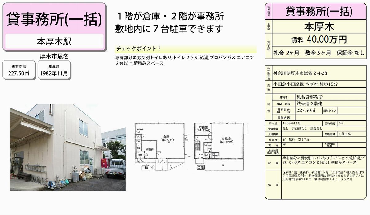 トップページ > 物件検索 > 神奈川県 の貸倉庫・貸工場 > 厚木市 の貸倉庫・貸工場 > 厚木市恩名2-4-28 恩名貸事務所