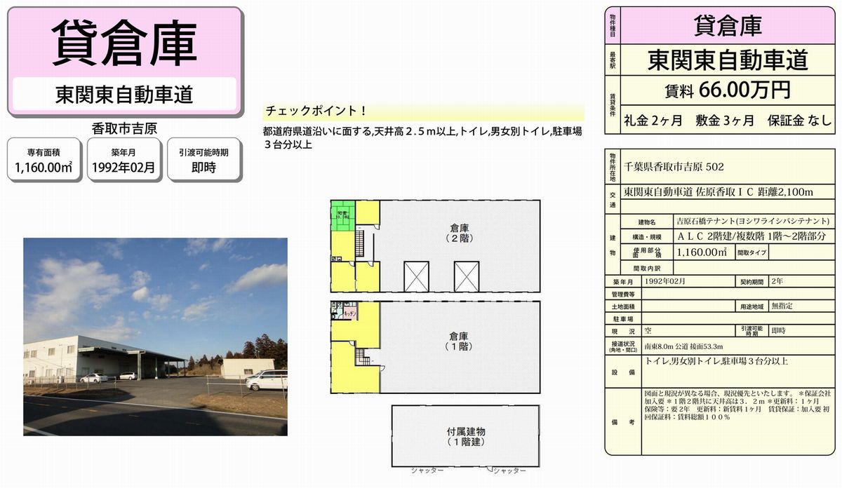 テナントSNAPでは千葉県香取市吉原502をはじめ、東京・神奈川・千葉・埼玉・横浜・川崎等、首都圏を中心に貸し倉庫・工場・貸し土地の情報を簡単検索。千葉県香取市吉原502のクレーン付、キュービクル、工業地域の貸倉庫・貸工場も情報満載!千葉県香取市吉原502で貸し倉庫・貸し工場・貸地・貸倉庫・貸工場・貸地は物件数No1のテナントSNAPにお任せ下さい。その他、千葉県香取市吉原502で貸し倉庫・工場・貸し土地を所有のオーナー様には無料で貸し倉庫・貸し工場の広告を掲載致します。貸し倉庫・工場・貸し土地を貸したい方も是非、テナントSNAPにお任せ下さい。 |