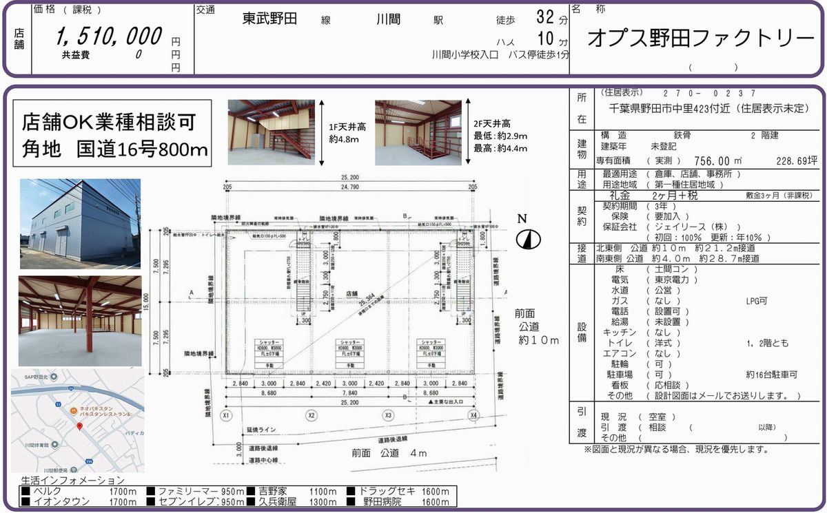 千葉県野田市中里423 オプス野田ファクトリー 詳細データ