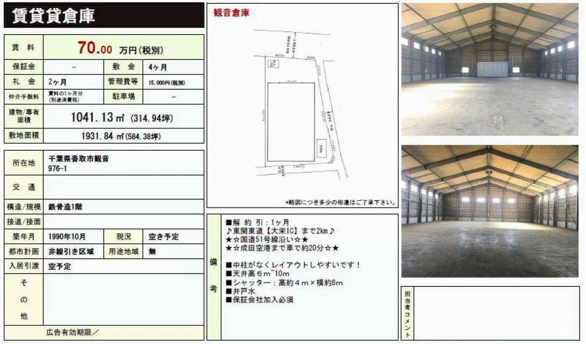 テナントSNAPでは千葉県香取市観音976-1をはじめ、東京・神奈川・千葉・埼玉・横浜・川崎等、首都圏を中心に貸し倉庫・工場・貸し土地の情報を簡単検索。千葉県香取市観音976-1のクレーン付、キュービクル、工業地域の貸倉庫・貸工場も情報満載!千葉県香取市観音976-1で貸し倉庫・貸し工場・貸地・貸倉庫・貸工場・貸地は物件数No1のテナントSNAPにお任せ下さい。その他、千葉県香取市観音976-1で貸し倉庫・工場・貸し土地を所有のオーナー様には無料で貸し倉庫・貸し工場の広告を掲載致します。貸し倉庫・工場・貸し土地を貸したい方も是非、テナントSNAPにお任せ下さい。 |