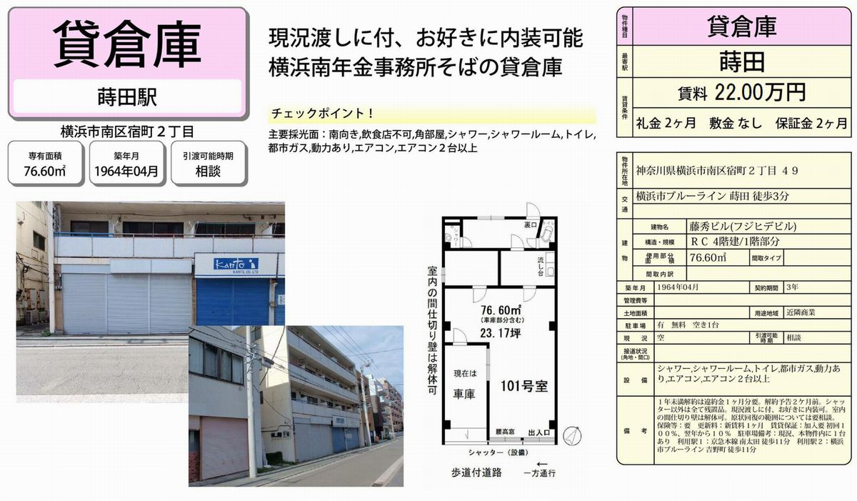トップページ > 物件検索 > 神奈川県 の貸倉庫・貸工場 > 横浜市南区 の貸倉庫・貸工場 > 横浜市南区宿町2-49 藤秀ビル