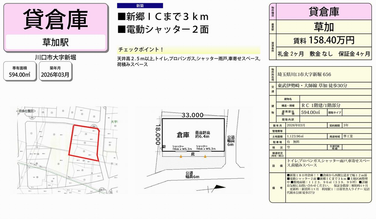 埼玉県川口市新堀656 草加 貸倉庫 詳細データ