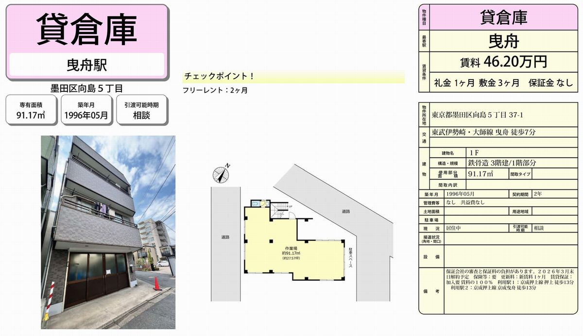 トップページ > 物件検索 > 東京都 の貸倉庫・貸工場 > 墨田区 の貸倉庫・貸工場 > 墨田区向島5-37-1 曳舟 貸倉庫