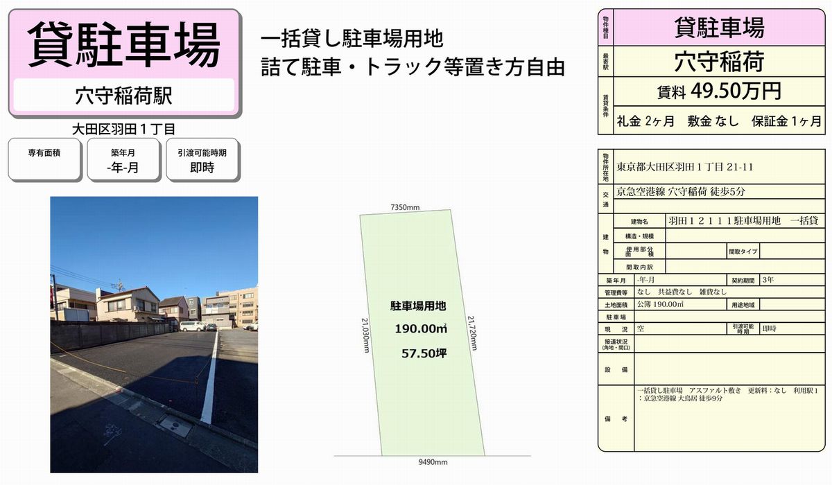 トップページ > 物件検索 > 東京都 の貸倉庫・貸工場 > 大田区 の貸倉庫・貸工場 > 大田区羽田1-21-11 穴守稲荷 貸地