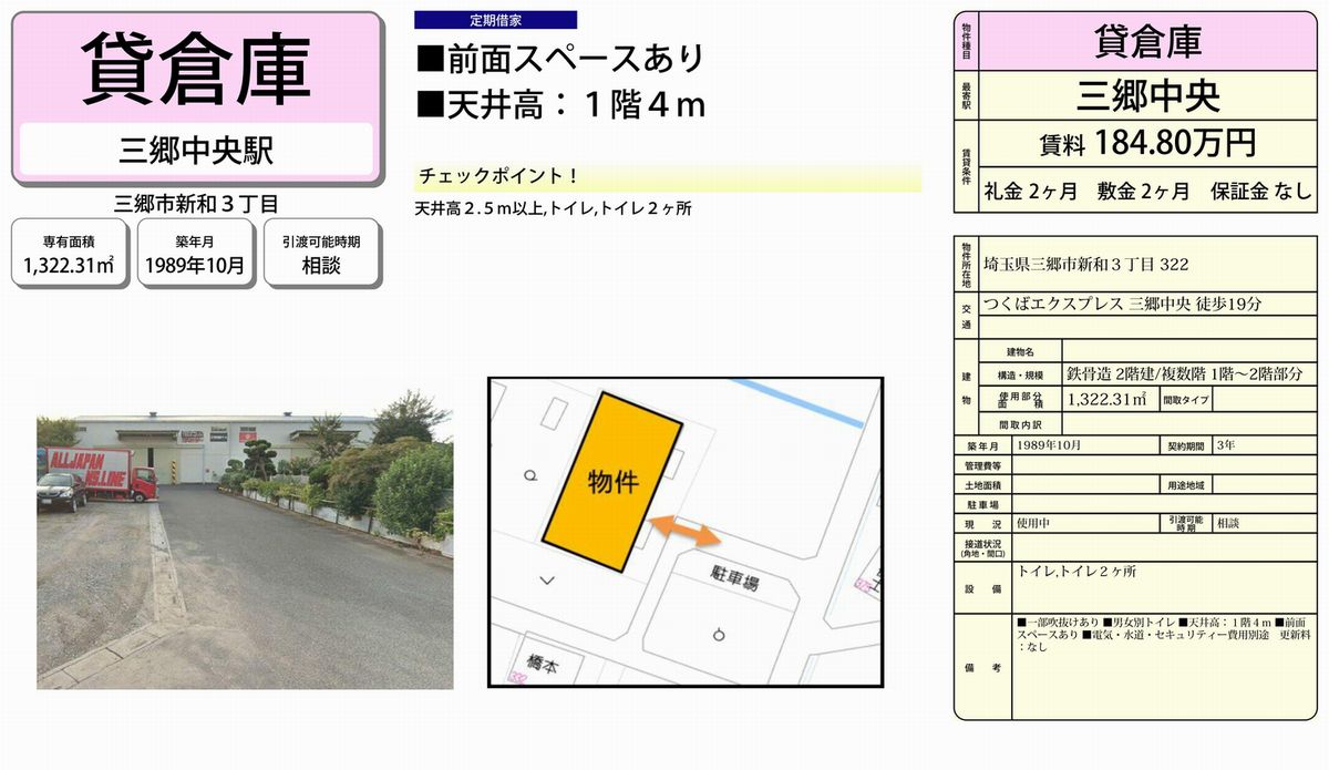 埼玉県三郷市新和3-322 三郷中央 貸倉庫 詳細データ