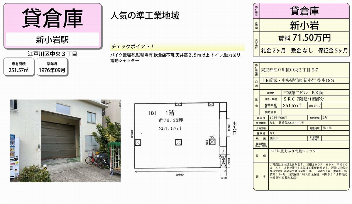 テナントSNAPでは東京都江戸川区中央3-9-7をはじめ、東京・神奈川・千葉・埼玉・横浜・川崎等、首都圏を中心に貸し倉庫・工場・貸し土地の情報を簡単検索。東京都江戸川区中央3-9-7のクレーン付、キュービクル、工業地域の貸倉庫・貸工場も情報満載!東京都江戸川区中央3-9-7で貸し倉庫・貸し工場・貸地・貸倉庫・貸工場・貸地は物件数No1のテナントSNAPにお任せ下さい。その他、東京都江戸川区中央3-9-7で貸し倉庫・工場・貸し土地を所有のオーナー様には無料で貸し倉庫・貸し工場の広告を掲載致します。貸し倉庫・工場・貸し土地を貸したい方も是非、テナントSNAPにお任せ下さい。 |