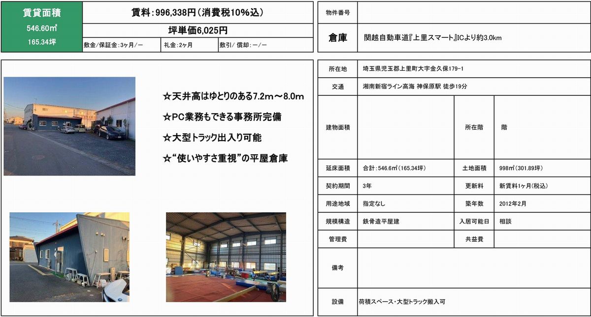 埼玉県児玉郡上里町金久保179-1 神保原 貸倉庫 詳細データ