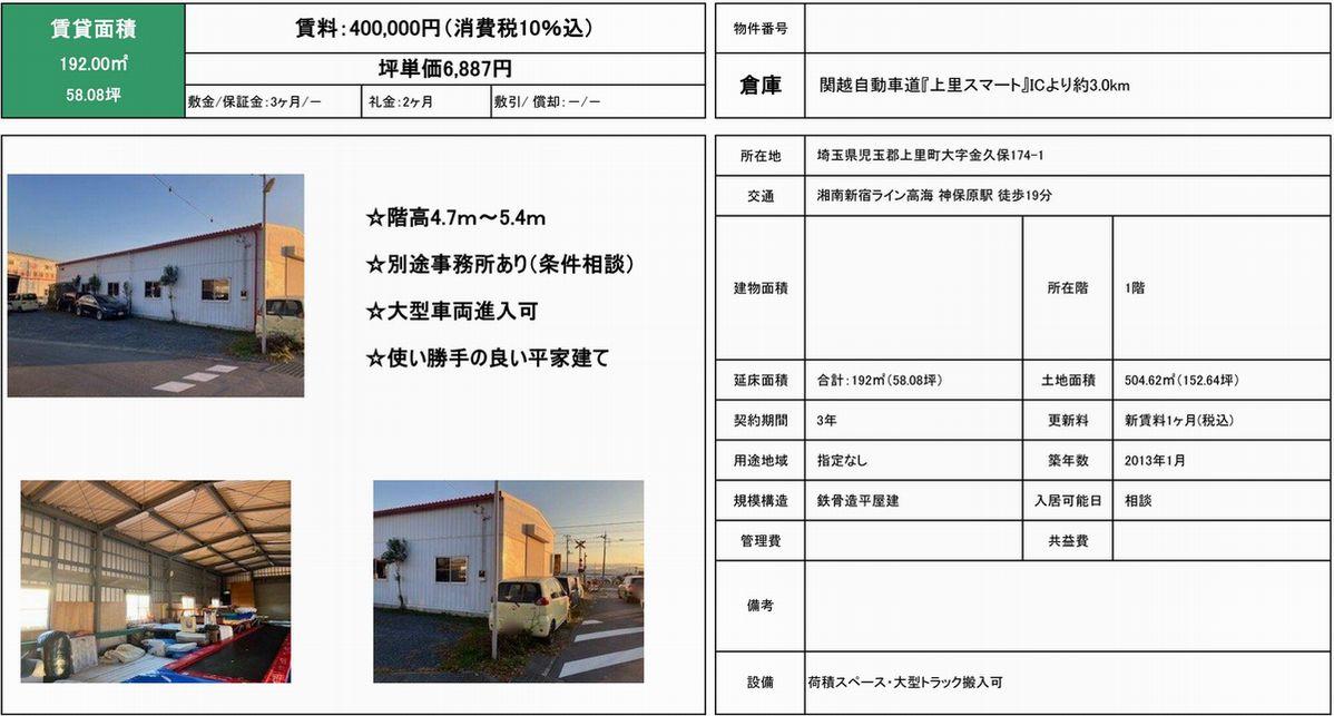 埼玉県児玉郡上里町金久保174-1 神保原 貸倉庫 詳細データ