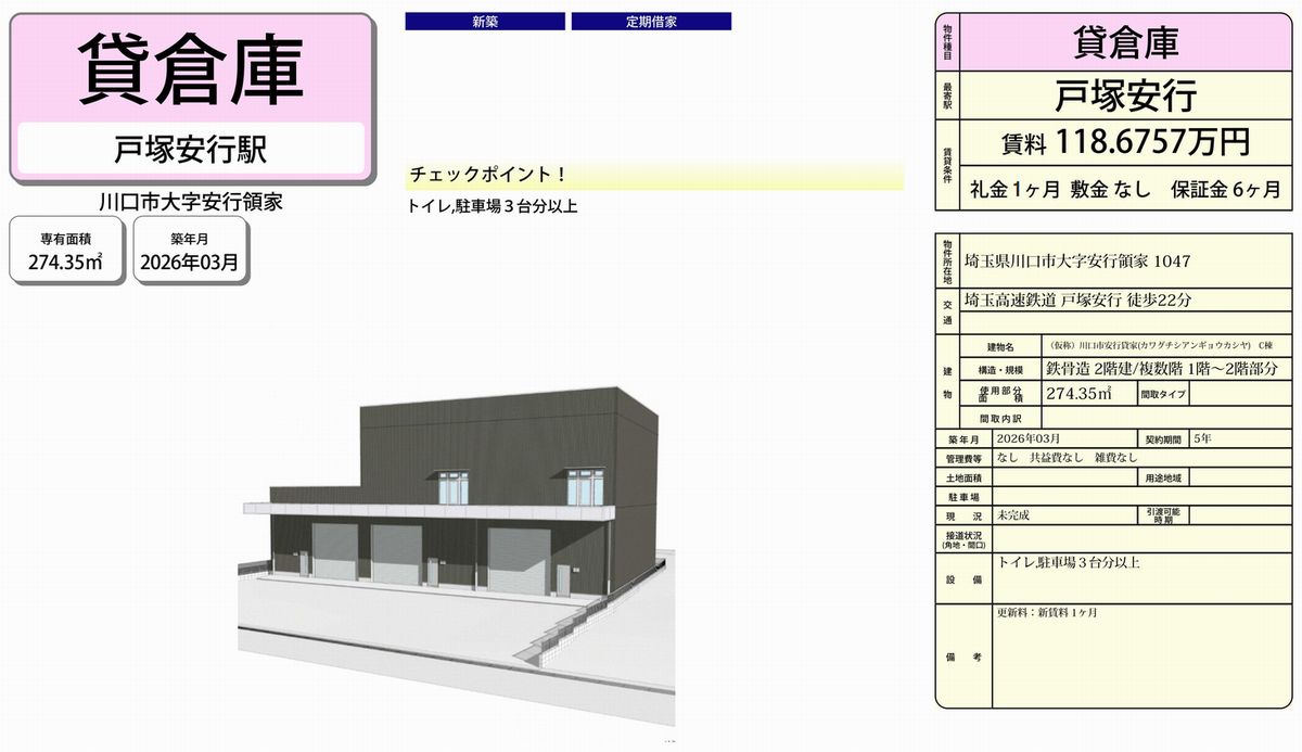 埼玉県川口市安行領家1047 戸塚安行 貸倉庫 詳細データ