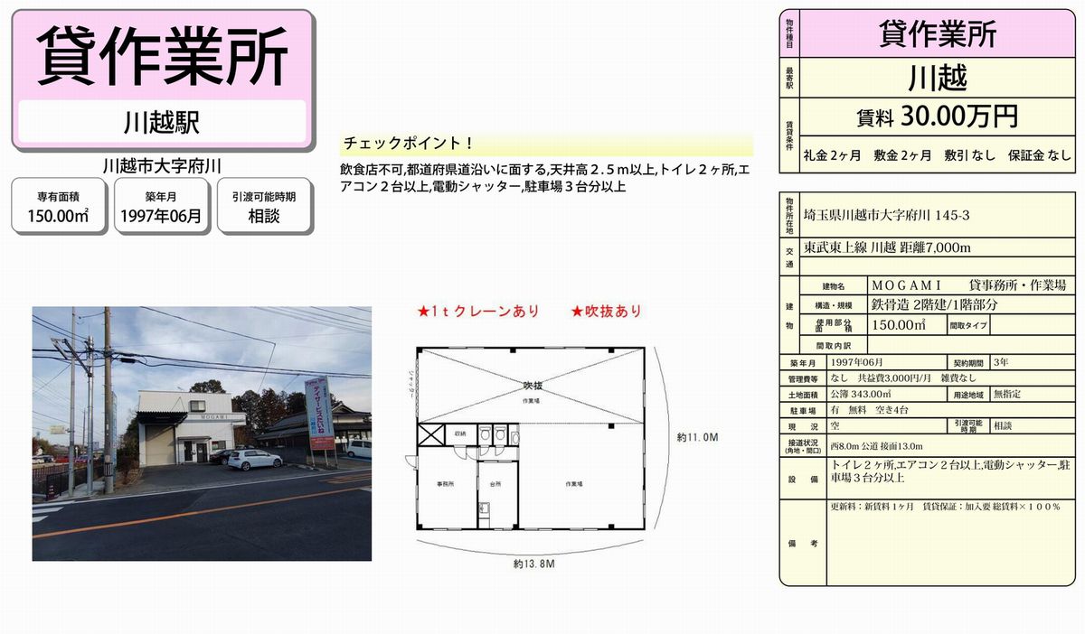 埼玉県川越市府川145-3 MOGAMI貸倉庫 詳細データ