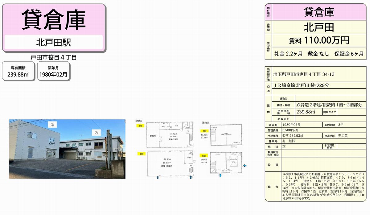 埼玉県戸田市笹目4-34-13 北戸田 貸倉庫 詳細データ