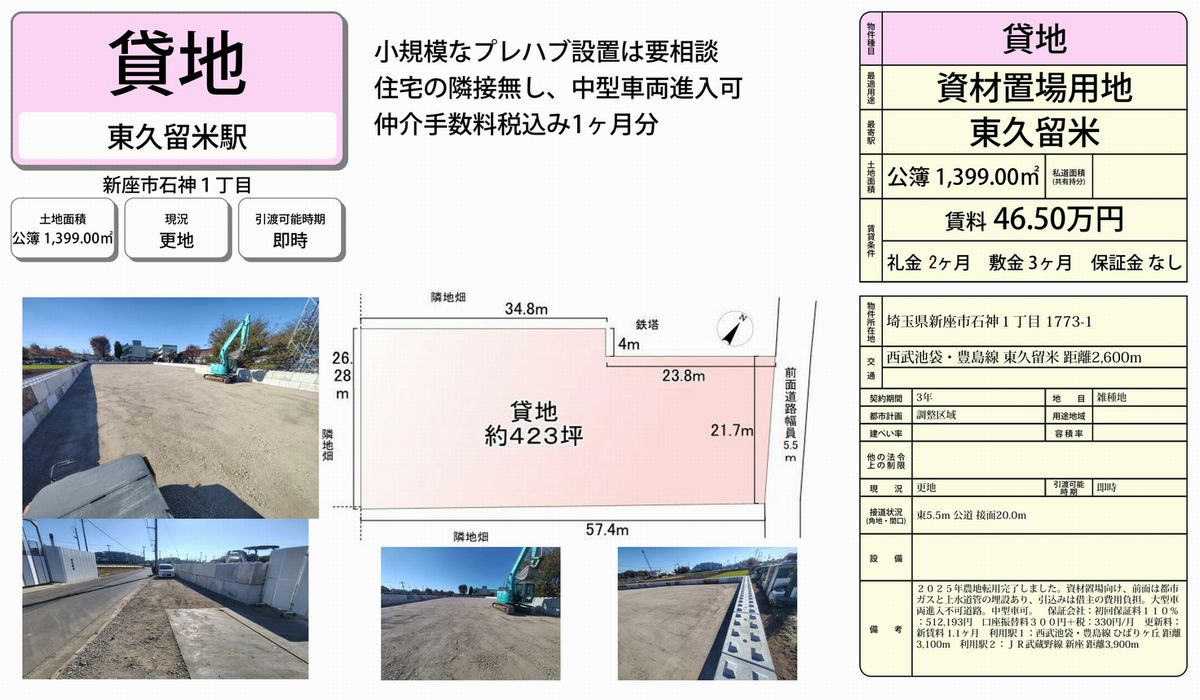 トップページ > 物件検索 > 埼玉県 の貸倉庫・貸工場 > 新座市 の貸倉庫・貸工場 > 新座市石神1-1773-1 東久留米 貸地