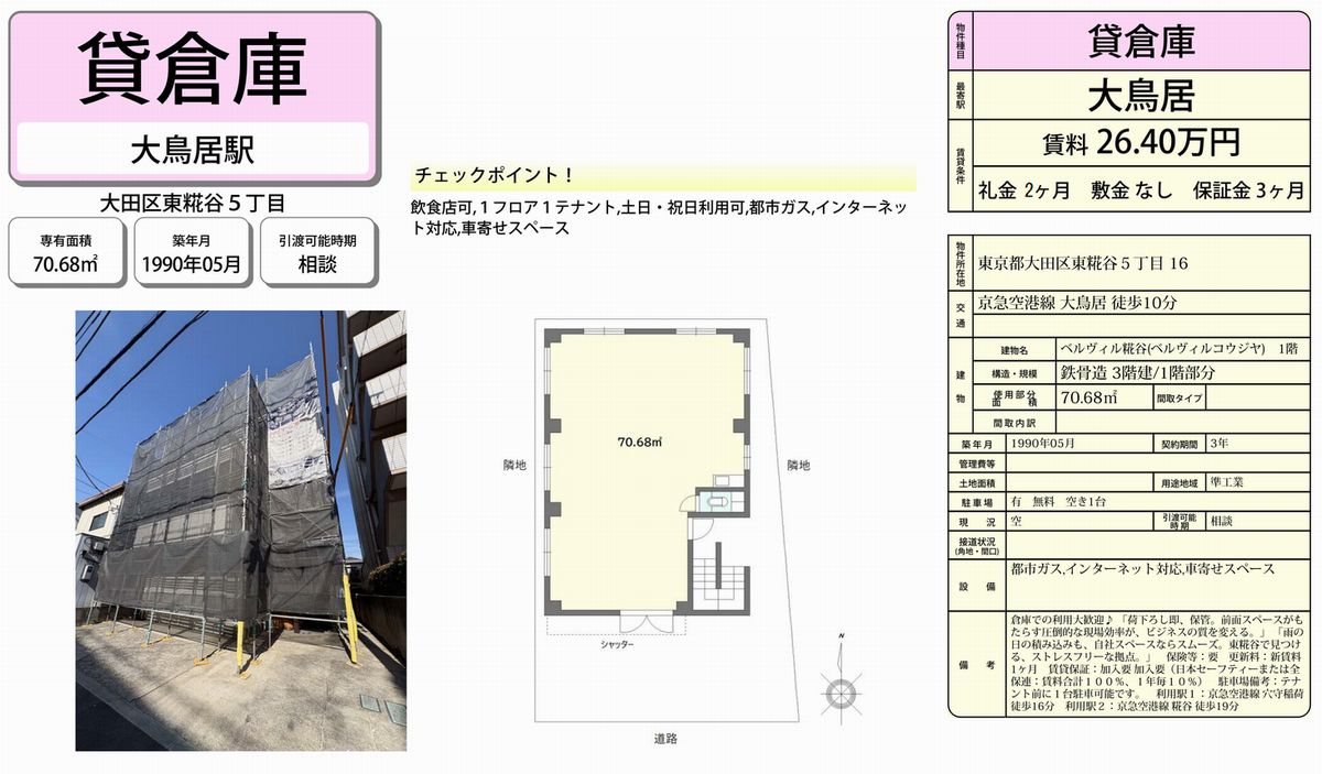 トップページ > 物件検索 > 東京都 の貸倉庫・貸工場 > 大田区 の貸倉庫・貸工場 > 大田区東糀谷5-16 ベルヴィル糀谷