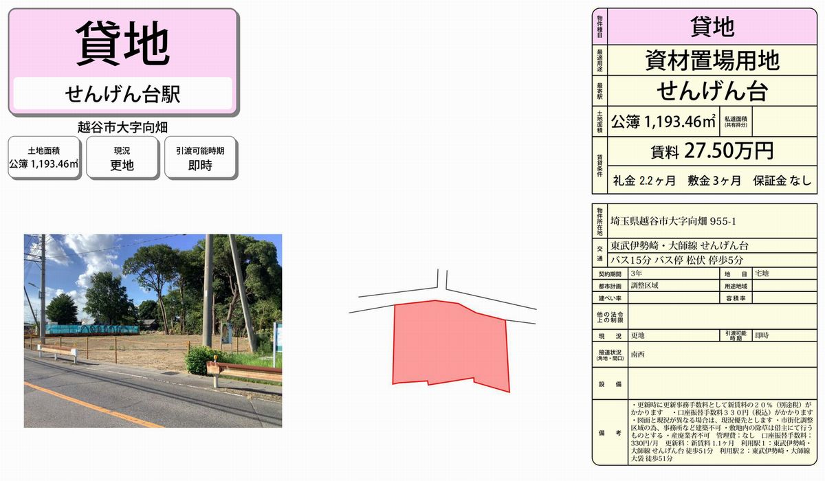 トップページ > 物件検索 > 埼玉県 の貸倉庫・貸工場 > 越谷市 の貸倉庫・貸工場 > 越谷市向畑955-1 せんげん台 貸地