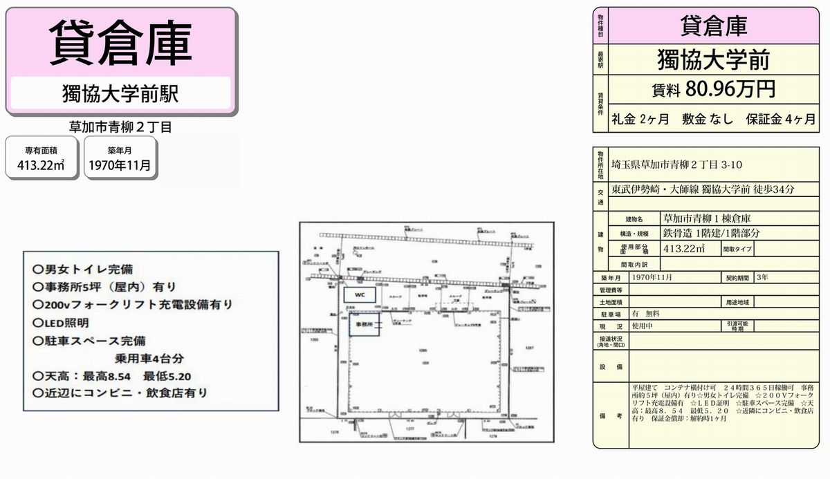 埼玉県草加市青柳2-3-10 獨協大学前 貸倉庫 詳細データ
