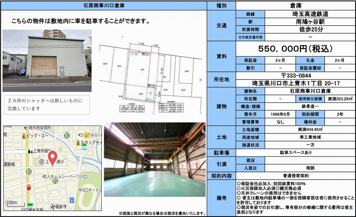 埼玉県川口市上青木1-20-17 南鳩ヶ谷 貸倉庫 詳細データ