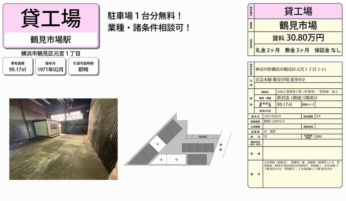 神奈川県横浜市鶴見区元宮1-1-11 山田工業所貸工場3 詳細データ