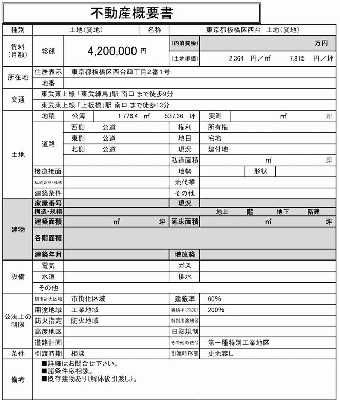 トップページ > 物件検索 > 東京都 の貸倉庫・貸工場 > 板橋区 の貸倉庫・貸工場 > 板橋区西台4-2-1 東武練馬 貸地