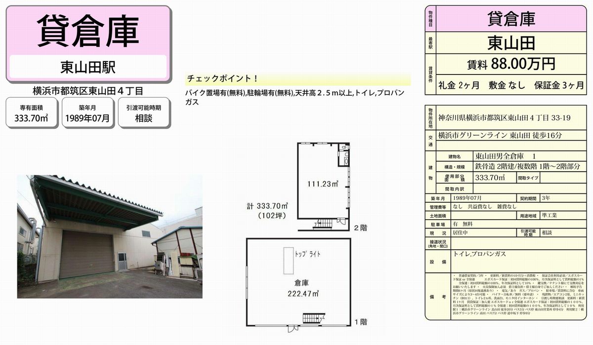 神奈川県横浜市都筑区東山田4-33-19 東山田 貸倉庫 詳細データ