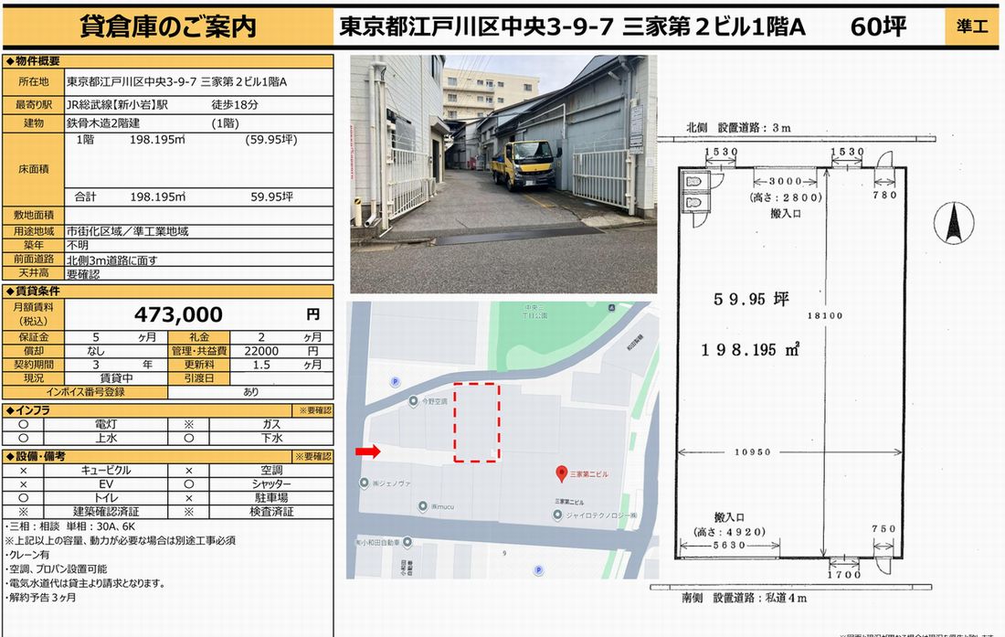 トップページ > 物件検索 > 東京都 の貸倉庫・貸工場 > 江戸川区 の貸倉庫・貸工場 > 江戸川区中央3-9-7 三家第2ビル